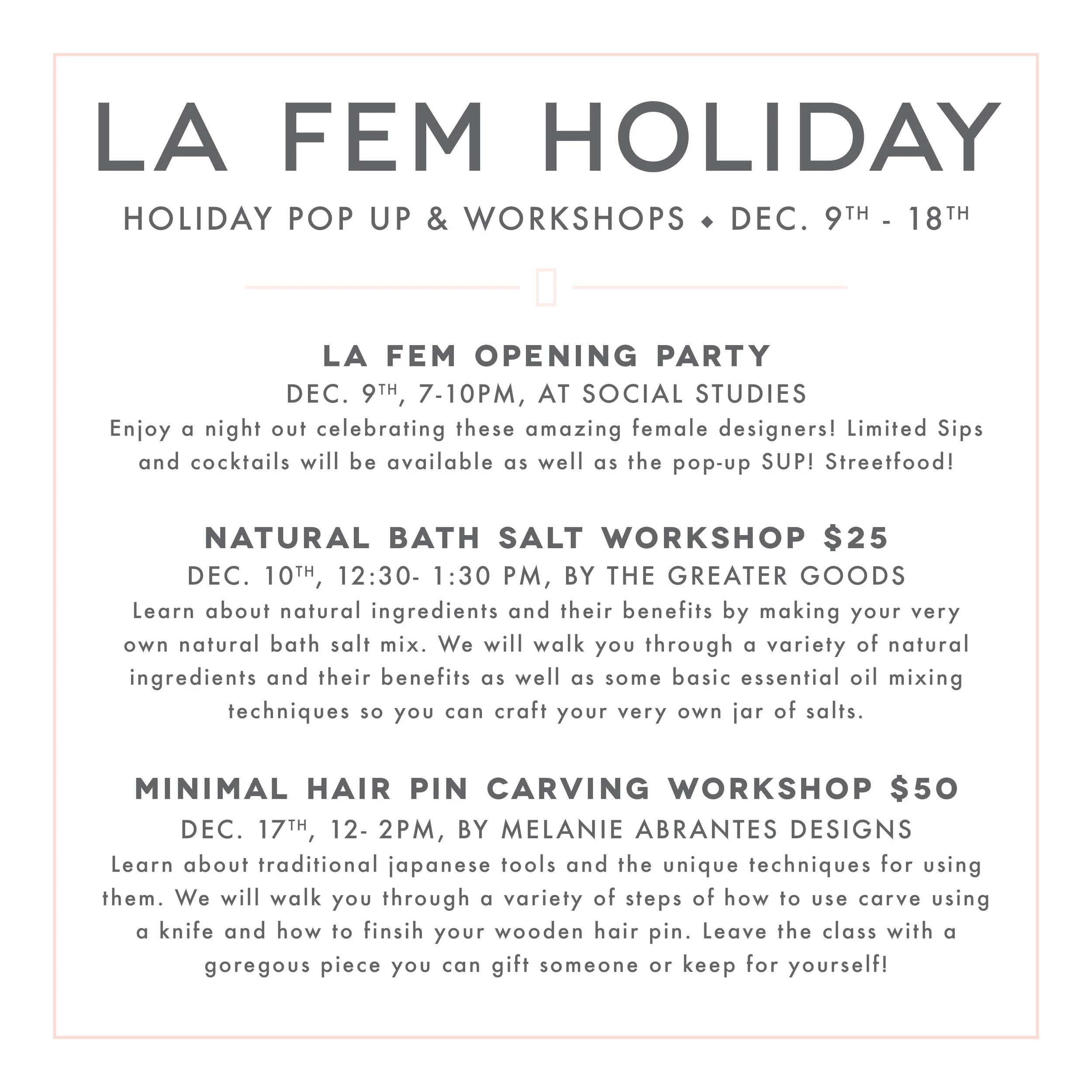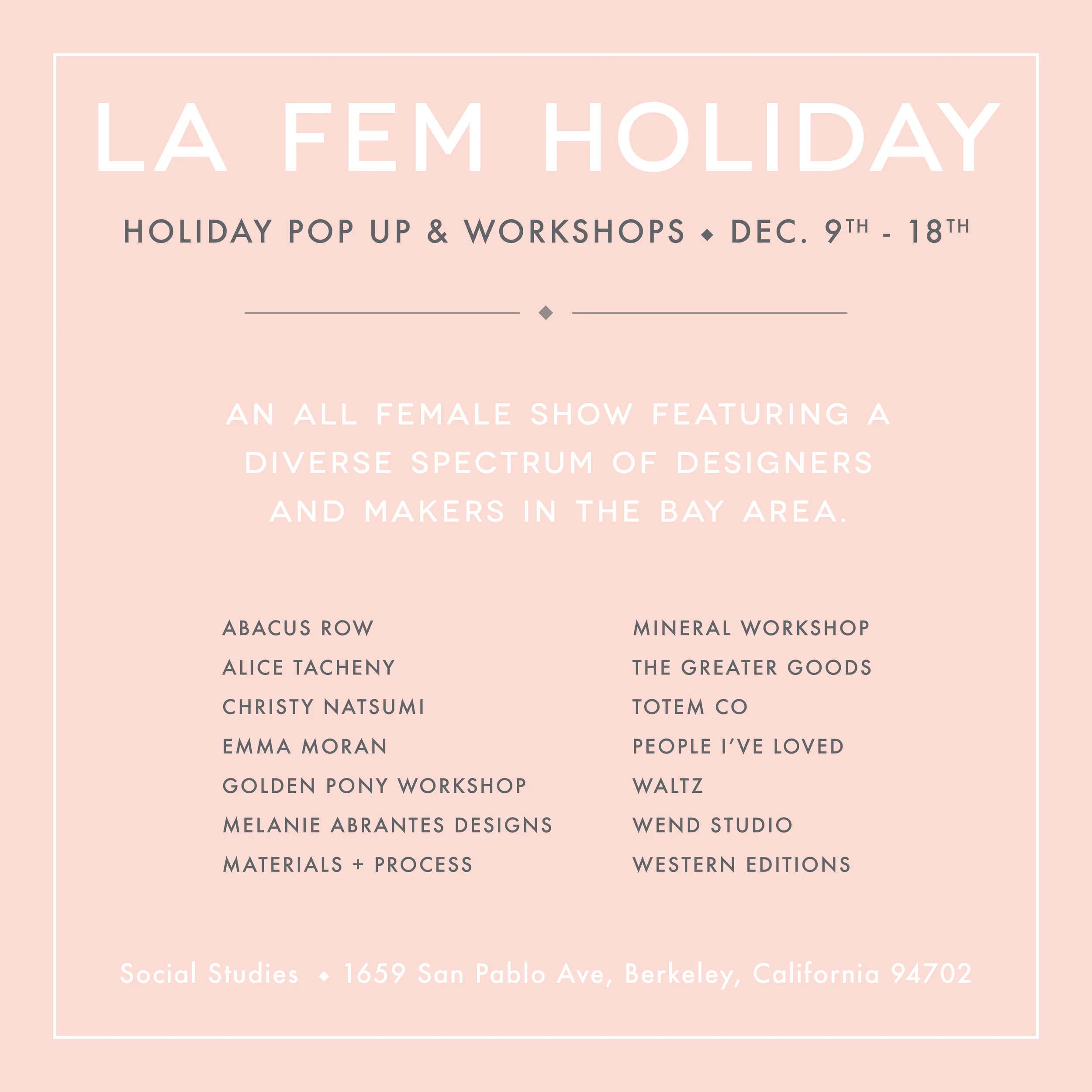 LA FEM Holiday Pop-Up is taking over Social Studies this December! The Holiday Pop-Up is a gorgeously curated temporary space exclusively featuring Female Designers and makers working in the Bay Area! We're highlighting the diverse spectrum of female creatives in our city and can't wait to show off the work of this talented group.