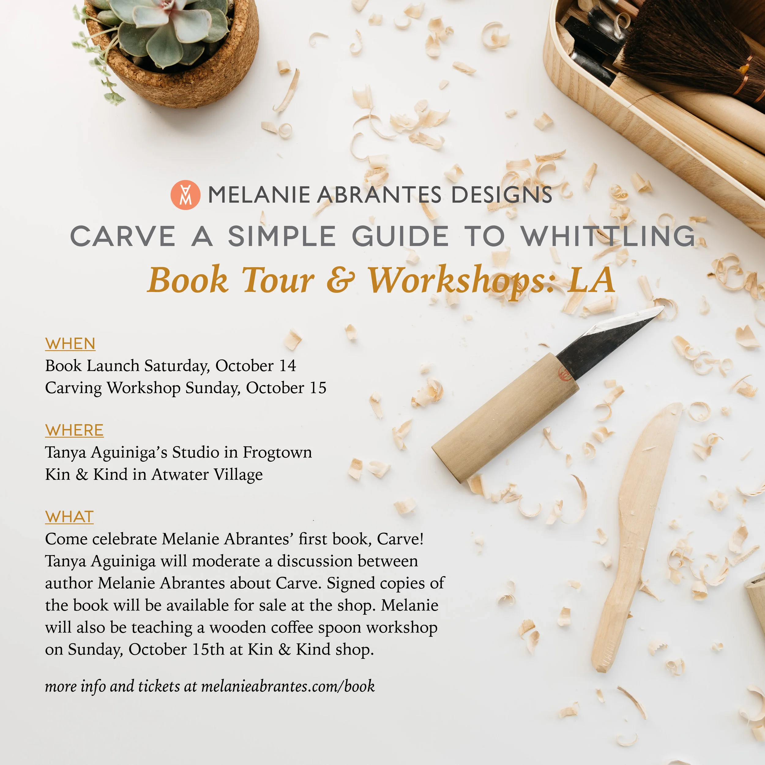 Join us for an evening celebration followed by an afternoon workshop for the book launch of Carve with author Melanie Abrantes, founder of Melanie Abrantes Designs.